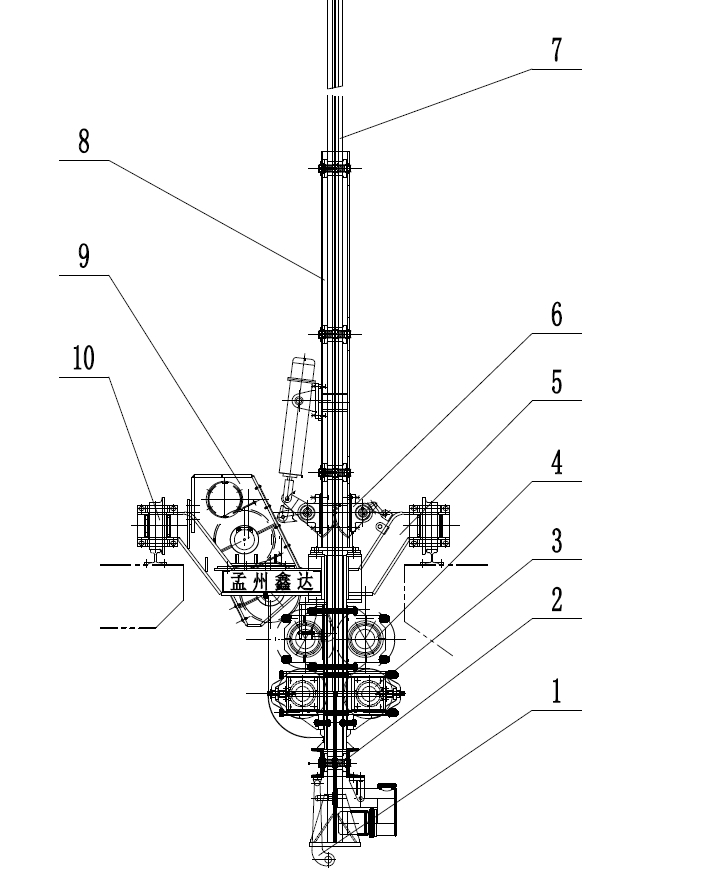 如上图,其中:1.安全挡装置;2.导向轮装置;3.弹性轮装置;4.齿轮组;5.下部机架;6.停锤装置;7.捣固锤;8.上部机架;9.变速机;10.车轮装置。
